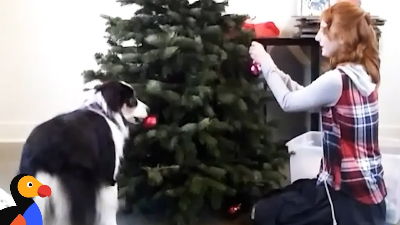 Smart dog decorates christmas tree